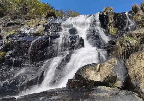 站在平均海拔820米的山间,远眺青山如波、层峦叠嶂,近观峡谷纵横、溪涧潺潺,凤尾瀑布如白布垂悬于山谷间,浩浩荡荡、气势磅礴。