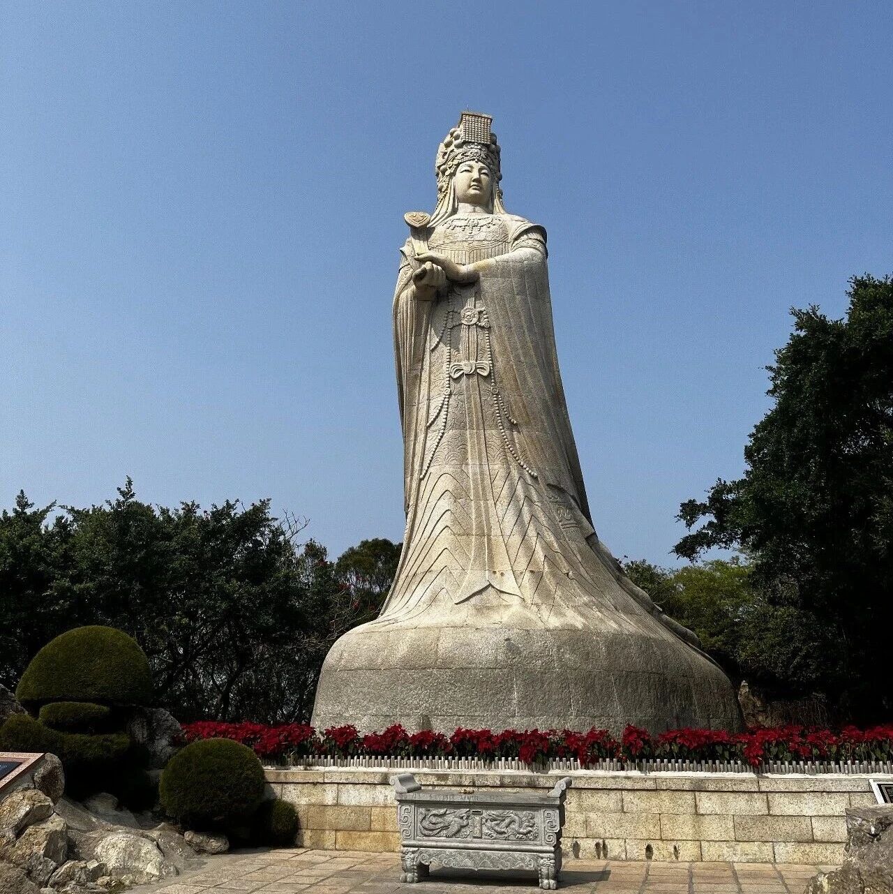 其中,最令人印象深刻的便是矗立在湄屿最高峰的妈祖石雕像。雕像高14.35米,寓意着全岛14.35平方公里的面积,她身披霞帔,头顶冕旒,面容和蔼慈祥,目光温柔而坚定,面朝东南方向,与台湾北港朝天宫的妈祖石雕像遥遥相望,默默祈愿台湾海峡永久安宁、两岸同胞福祉绵长。雕像的每一处细节都彰显着妈祖文化的博爱与祥和,也让在场的每一位员工深深感受到了两岸同胞血脉相连、守望相助的深厚情谊。大家纷纷驻足合影,定格下这一庄严而美好的瞬间,在欣赏美景的同时,也接受了一次深刻的文化熏陶与精神洗礼。