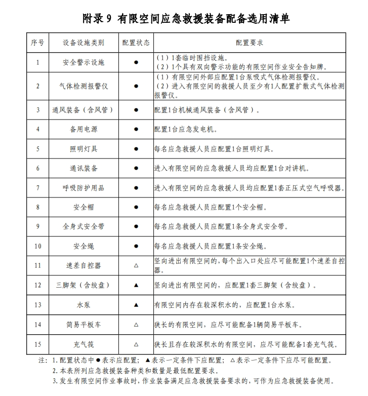 5.1.2 应急救援装备包括正压式空气呼吸器、安全绳、全身式安全带、救援三脚架、速差自控器、应急照明、通讯装备、大功率通风装备、备用电源等。